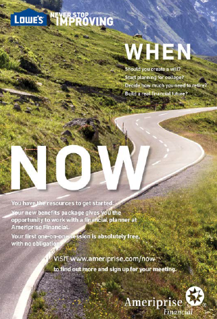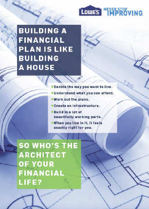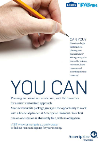 To create a co-branded ad campaign directed specifically to employees of Lowe's, Ameriprise wanted to forge both brands to create a solution for personal investing that presented as strong as the united brands could be. Uniting "never stop improving" with "more within reach" we developed campaigns that talked about the value of working with an expert and the principles of always being focused on adding value when you build.